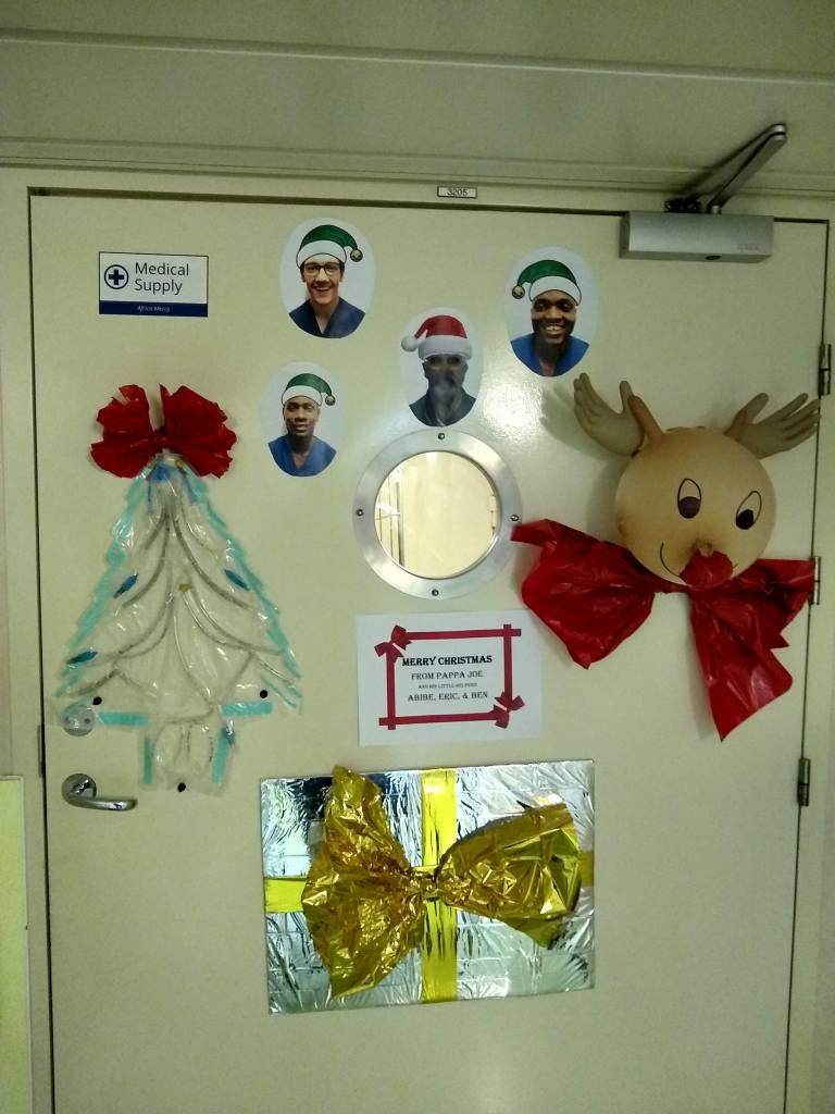 The door to our supply office. Decorated from expired medical supplies (breathing tubes, adhesive plastic sheeting, exam gloves, emergency blankets, and biohazard bags).