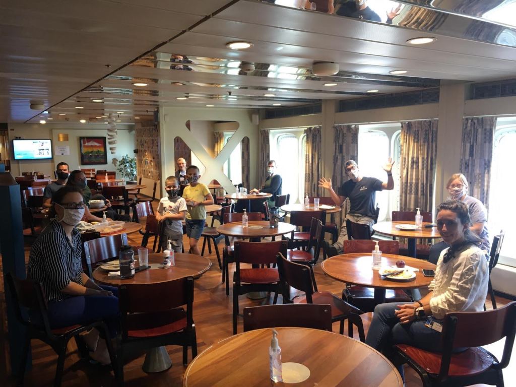 In the middle of this crazy time of pack up and ship preparation, I personally hit a speed bump. A week after we created our ship bubble, sealing ourselves off from the outside world, I came down with a fever (101F). After notifying my doctor friend, I was placed in an empty family cabin to be isolated. My bunk mates were forced to stay within our cabin. The next morning, though I felt better, I was administered a COVID test by two of our lovely nurses fully outfitted in yellow isolation gowns and various safety accouterments. The test consisted of two swabs. The first swab was the back of my throat, no big deal. The second swab required going up my nose and needed to be twisted for 10 seconds against what I can only imagine was my brain. This was unpleasant but only caused a single tear due to physically squeezing one of my tear ducts. It was not as bad as I thought it would be but not something I plan to do again.